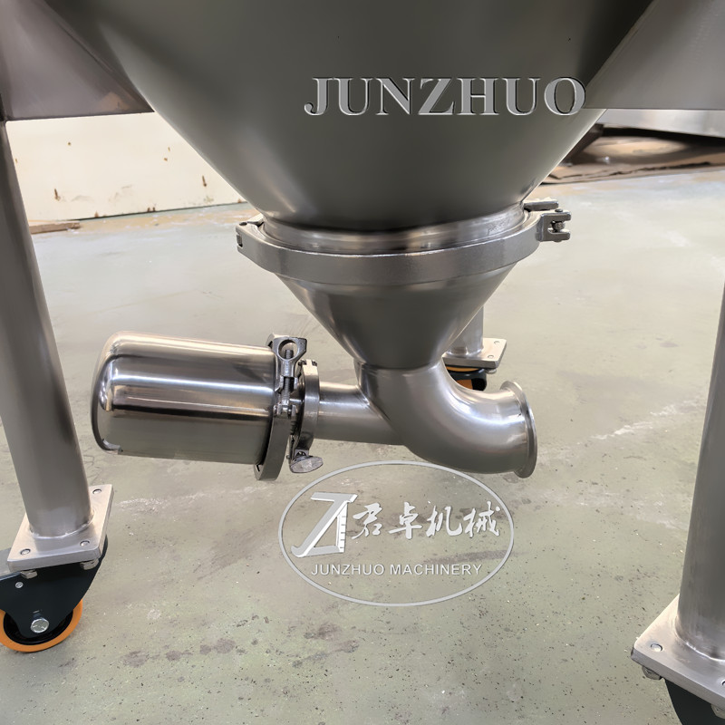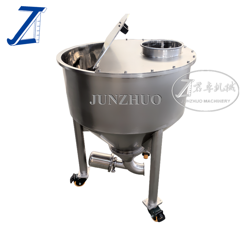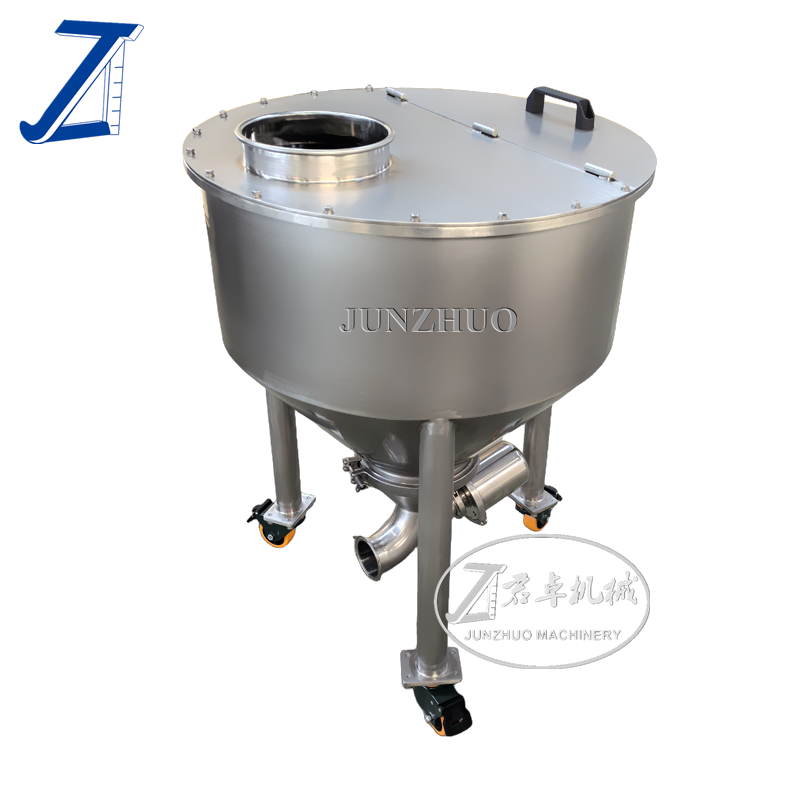 This bin is used for collecting output material, then enter the downstream pipeline to proceed to the next process (such as mixing, drying, and packaging). The volume is available to meet your requirement, such as 50L,100L,200L and so on. The bin is made by SS304 or SS316, it can meet with GMP standard.